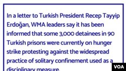 Komela Bijîşkên Cîhanê (WMA) li ser van geşedanan nameyek ji bo Serokomarên Tirkîyê Recep Tayyîp Erdogan, di malpera xwe de weşandin. Di vê nameyê de Erdogan hate protestokirin û jê hate daxwazkirin ku pêdivîyên van girtîyan di demeke kûrt de bê çereserkirin.